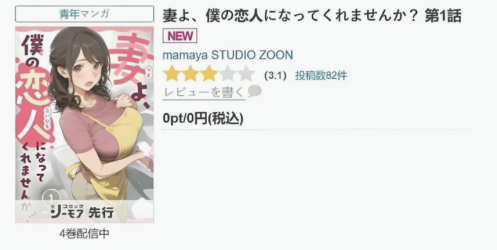 2025年12月,一部明确标识为AI制作的漫画《亲爱的妻子,你愿意成为我的恋人吗?》(妻ですが、恋人になってもいいですか?,非官方译名)在日本最大的电子书商店之一Comic C'moA上,取得了“青年漫画”类别排名第一的成绩。虽然评论区不乏对画面僵硬、背景单调的批评,但其关键内容被读者认为“质量极高”,最终支撑了销量。