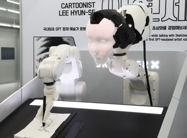 一台人工智能绘图机器人正在为访客绘制肖像画,图源:韩宣网