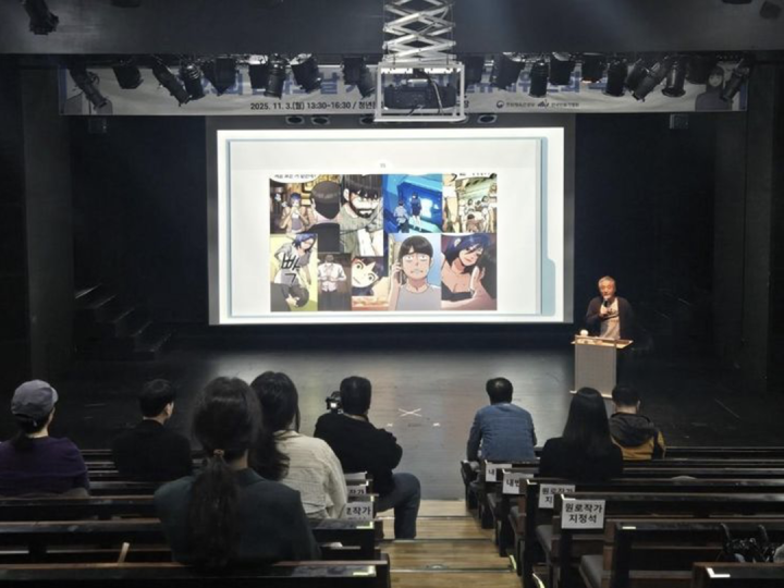 2025年11月3日,漫画家Kwak Baek-soo在首尔举行的年度漫画日仪式上,发表关于人工智能在漫画行业应用的讲座,图源:《韩国时报》、韩国漫画家协会